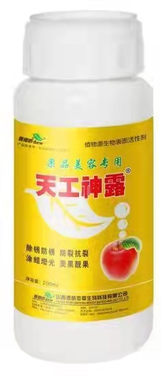 - 除銹防銹。可在果面產(chǎn)生一層天然保護(hù)膜—–“高脂膜”,阻止生物或非生物因子對(duì)果面侵染,預(yù)防化學(xué)農(nóng)藥對(duì)果面刺激產(chǎn)生果銹,并能溶解吸收果垢,凈化果面。