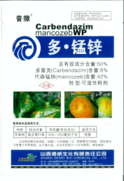 本品為廣譜治療兼保護(hù)性殺菌劑,是由多菌靈和代森錳鋅兩種制劑復(fù)配而成,具有保護(hù)和治療作用,無(wú)論發(fā)病前或發(fā)病早、中、晚期均可使用。由于兩者的協(xié)同殺菌效應(yīng),其藥效倍增,具有防治譜廣,不易產(chǎn)生抗性,防治效果明顯優(yōu)于單劑代森錳鋅、多菌靈的效果。對(duì)果樹(shù)、梨、葡萄、桃、柑桔、蔬菜、棉花、花生、煙等作物的多種真菌性病害,如蘋(píng)果樹(shù)斑點(diǎn)落葉病、褐斑病、輪紋病、炭疽病,柑桔樹(shù)瘡痂病等病害具有明顯的防治效果。本品細(xì)度愈高,藥效越好,對(duì)作物越安全,在花期、幼果期均可使用。